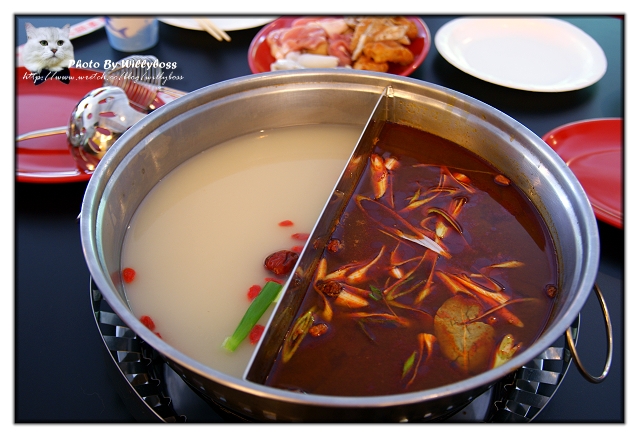 我們選擇的鍋底是豚骨和麻辣小辣,豚骨湯看起來很白很濃,不過個人感覺是覺得比較像是一般高湯口味,說特別倒也還好,反而麻辣小辣的口味很香又不會太辣,用來煮些容易入味的食材還頗不賴的。