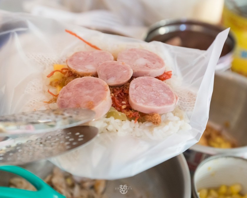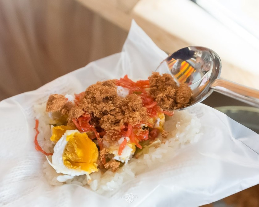 ↳熱騰騰的糯米飯舀上一匙沙茶醬,鋪上高麗菜、玉米粒與蛋絲,最後再放上學生們最愛的現炸雞排。