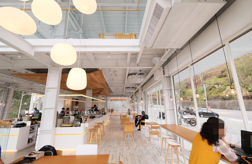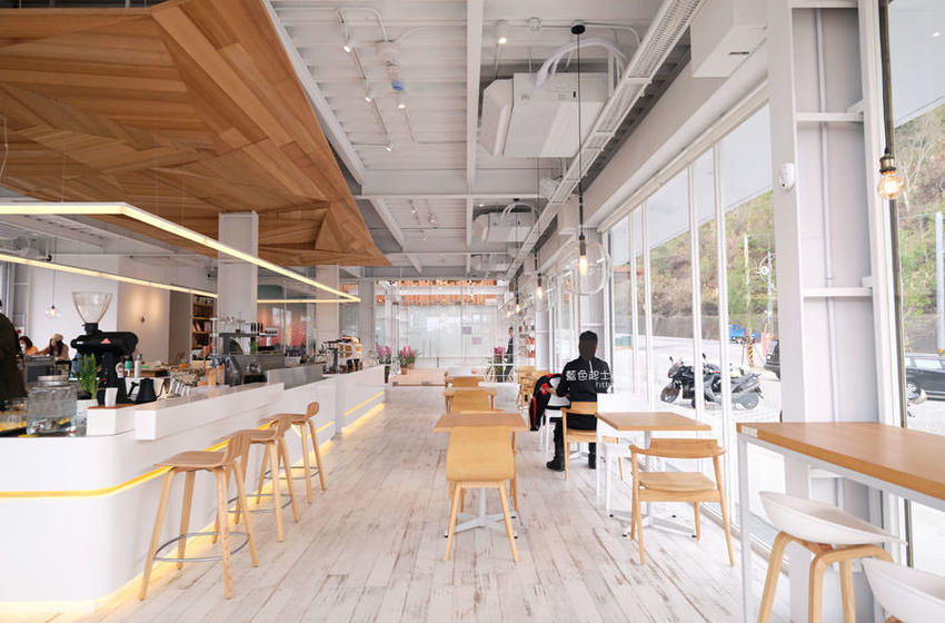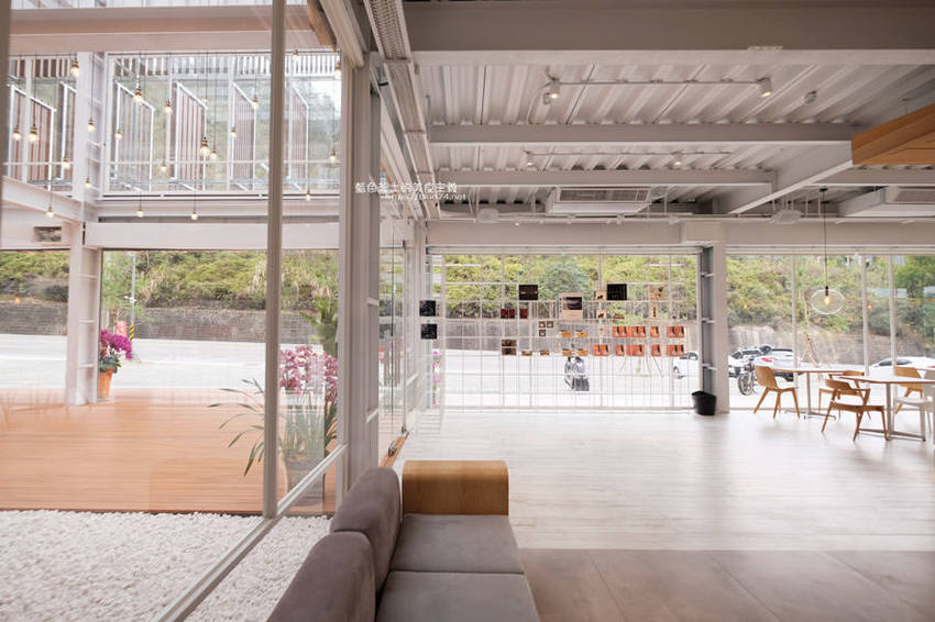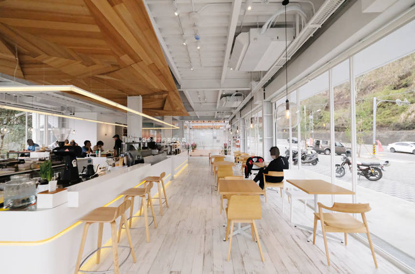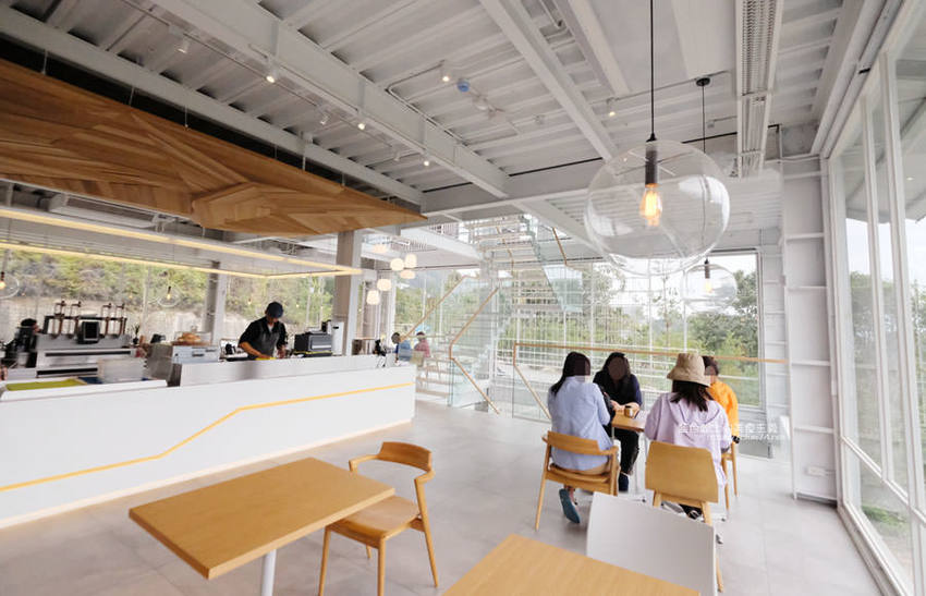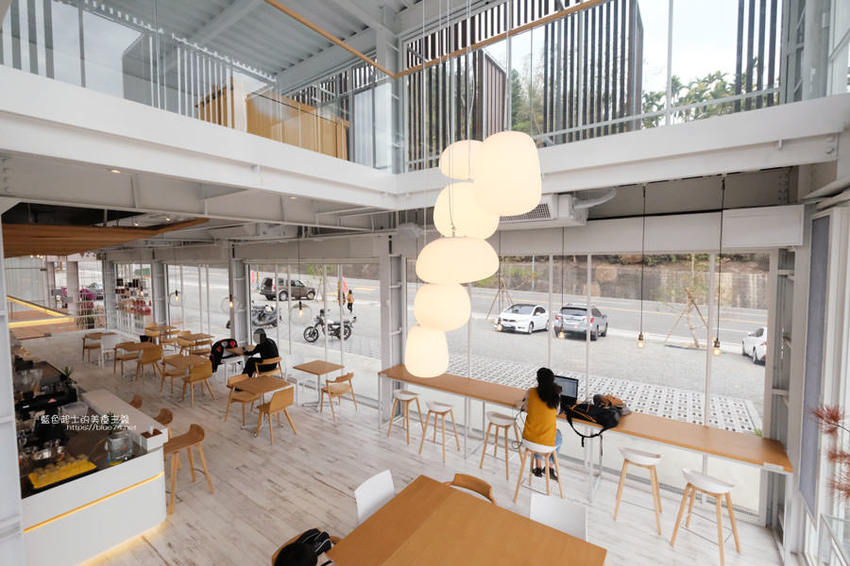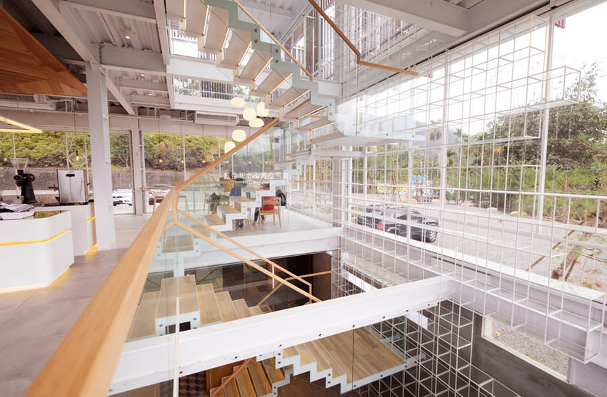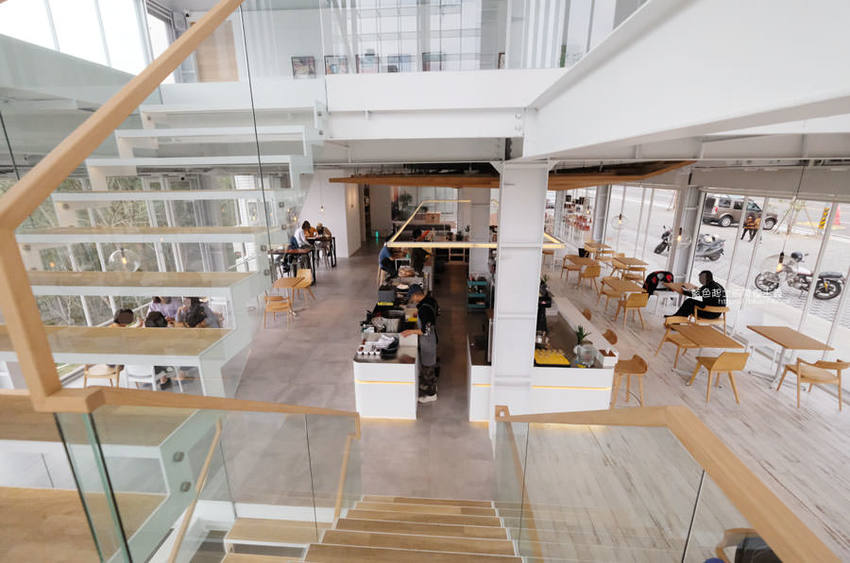 簡約白色系搭配木質調的桌椅及樓梯,一路延伸的樓梯也成為大家拍照取景的地點