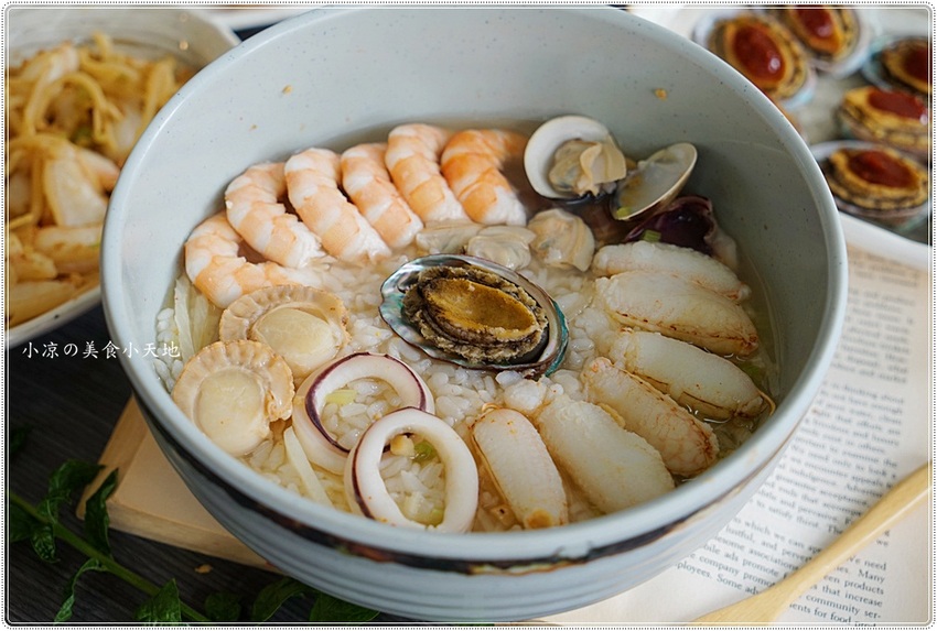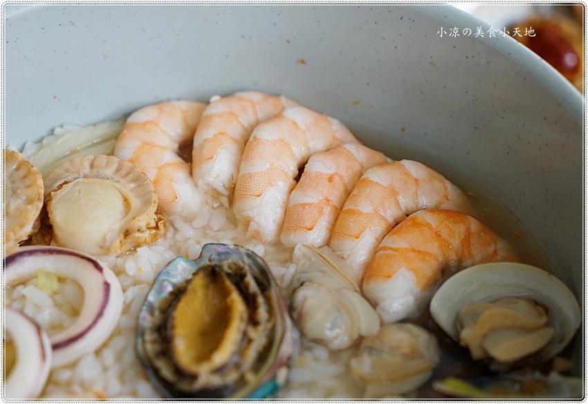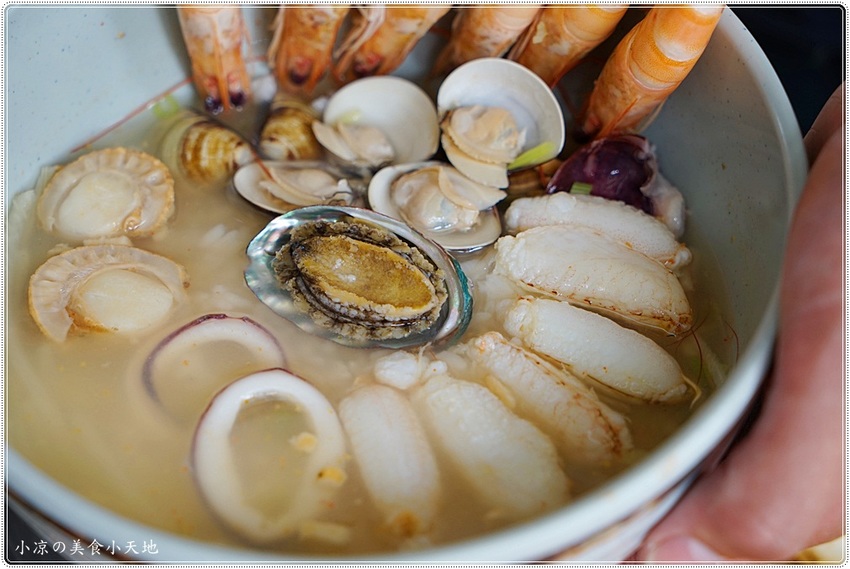 海產泡飯內有六種新鮮海鮮,白蝦、蟹肉、鮑魚、帆立貝、蛤蠣、透抽大卷