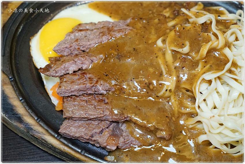 5盎司牛排鐵板麵,醬汁有黑胡椒、蘑菇、綜合可選