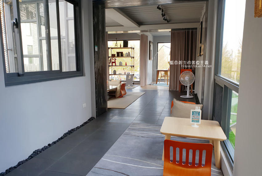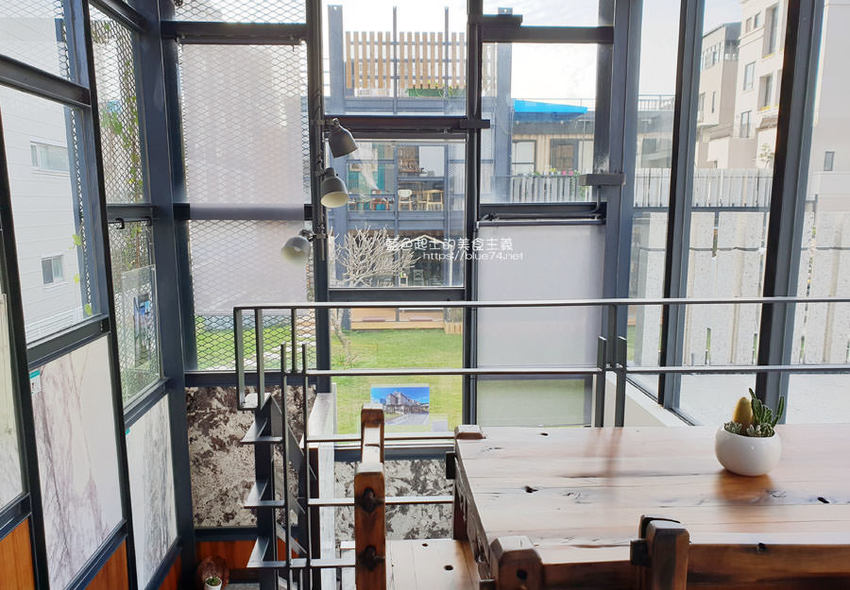 坐在一樓走廊上,看著前方的草地也是愜意~