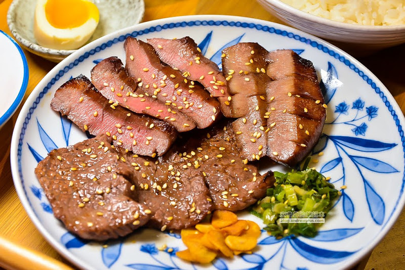 餐盤裡帶著粉紅色澤的是口感較脆口的薄切牛舌,右邊則是Q彈感的厚切牛舌,看起來油亮好食的切片是去骨牛小排