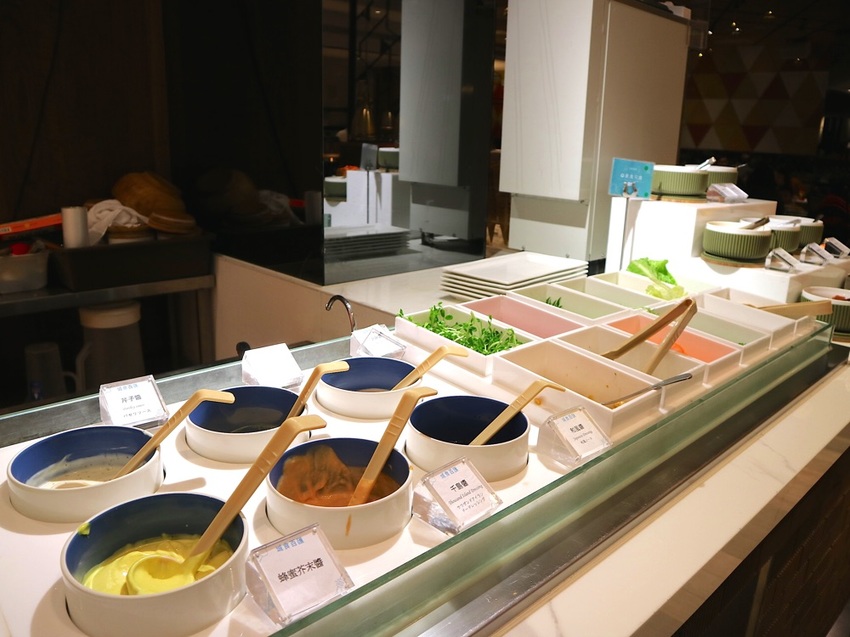 生菜沙拉區,小巧精緻;生菜有8種選擇、沙拉醬汁有6種、搭配的配料也有7種。