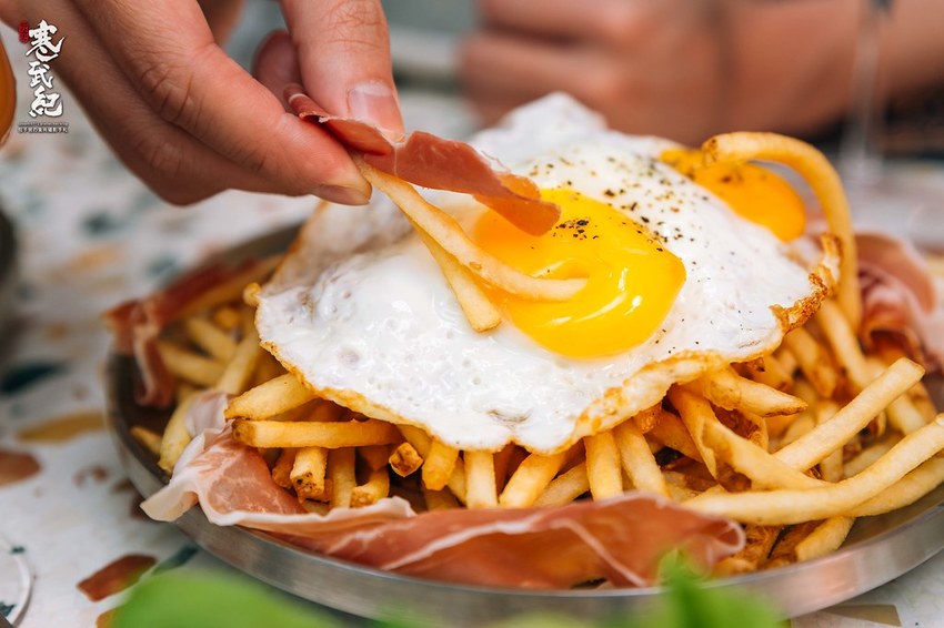 內行的人用手裹著生火腿和薯條,拿去沾金黃濃口的蛋黃,一口薯條一口啤酒,人生一大樂事也!