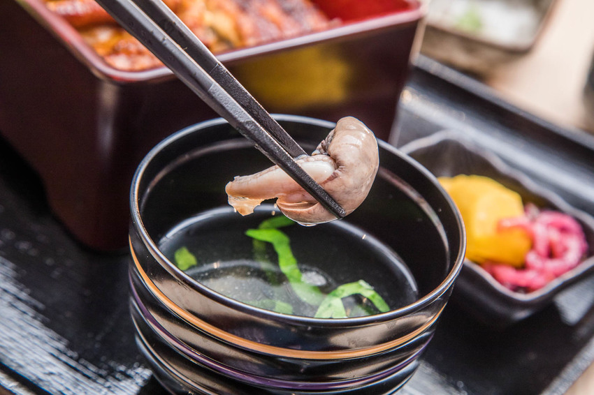 鰻重(大)還有附上一碗鰻肝清湯,鰻肝清湯喝來暖呼呼的相當清甜,鰻肝吃起來跟一般肝臟不大一樣,口感是QQ的而且沒有內臟類特有的味道,相當這特別