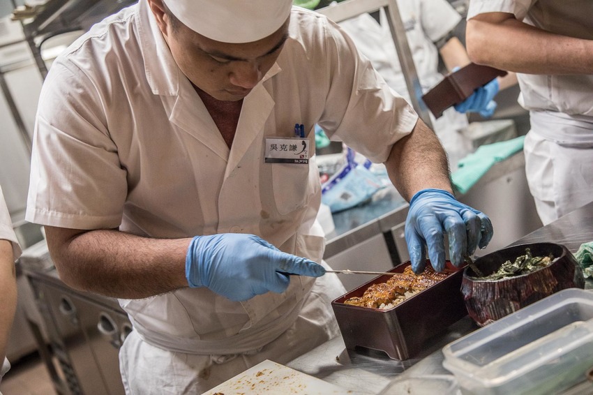 看著日本主廚將切好的鰻魚飯平舖在飯盒上,油亮的鰻魚飯令人食指大動,好生期待呢!