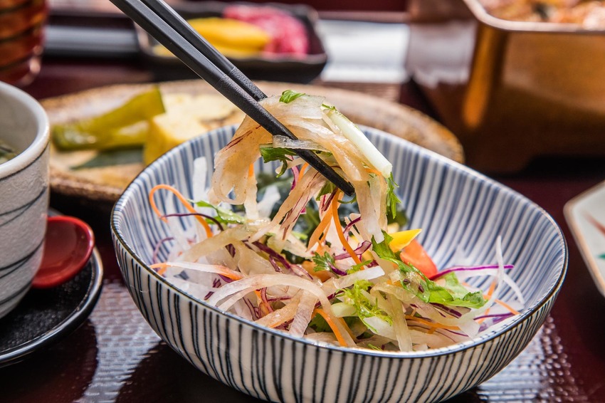 日式沙拉是用和風醬汁,洋蔥泡過水不會有嗆辣感,口感冰涼脆嫩,加上酸甜的和風醬汁,搭配多種爽脆生菜煞是開胃
