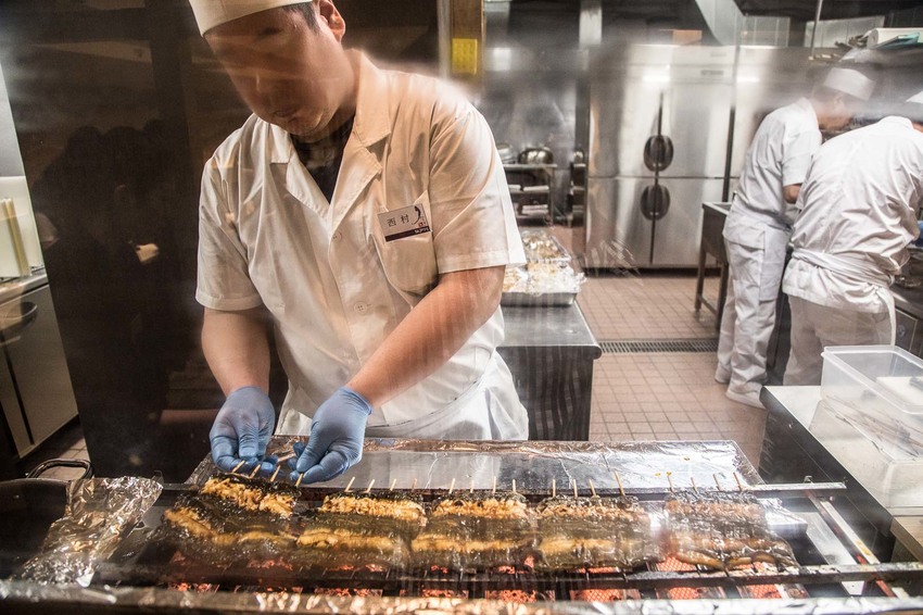 店的後方是開放式的廚房,江戶川鰻魚飯-台灣一號店特別派駐來自日本的大廚,從鰻魚的剖殺、蒸煮、燒烤等等料理流程完全按照日本江戶川鰻魚飯標準作法,在台灣原汁原味呈現,而開放式的廚房也可讓消費者一窺江戶川鰻魚飯製作的奧妙之處