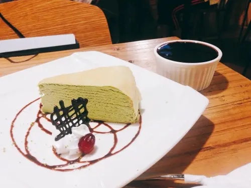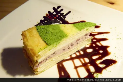 千層蛋糕中間的抹茶鮮奶油有冰淇淋的口感,抹茶微甜微苦而不膩,讓人一口接一口。