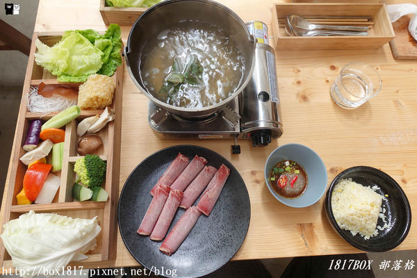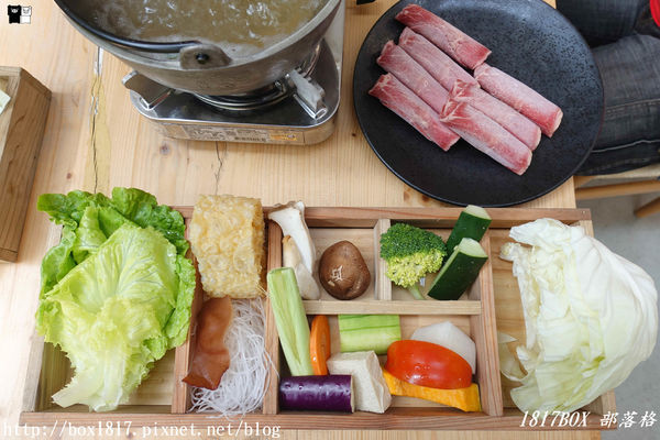 鍋物的時蔬擺盤也是利用木頭製成的容器裝,