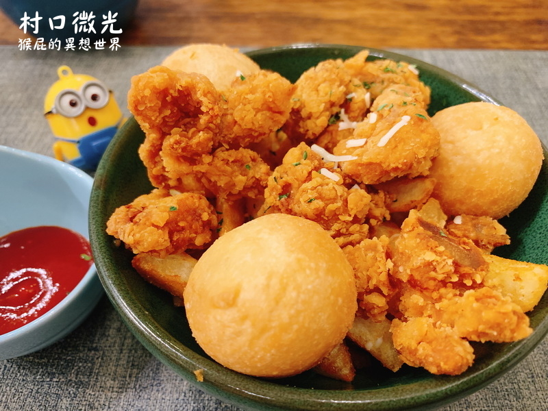 炸物拼盤有香濃起司球、唐揚雞、薯條,三種炸物一次滿足