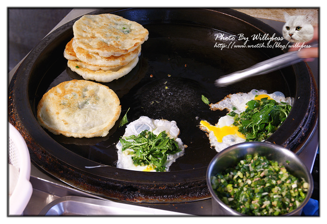 下鍋煎囉~這裡的蔥油餅很特別,除了麵糰裡面已經混入蔥花,下鍋之後還會再灑上一些,而且仔細看看那鍋蔥花還有拌著一些肉末,加蛋的話會再加上九層塔,兩份蛋有兩倍九層塔...鍋內的油放得挺不少,要說是炸的應該也不為過。