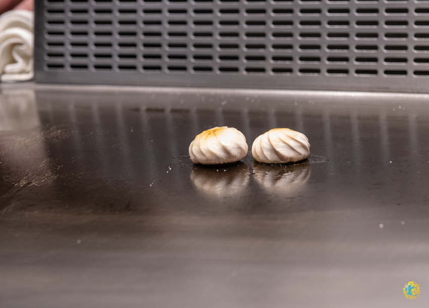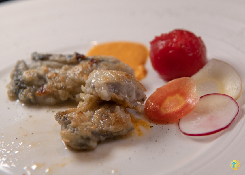 裹上一層薄薄麵粉香煎的廣島牡蠣,灑上岩鹽調味,金黃焦香的表皮把水分甜度都鎖在裡面,沾點稠密的海膽醬讓海味更加甘美,薄脆的表皮更添口感的層次,鮮嫩多汁又飽滿的廣島牡蠣,那鮮美的滋味在口中久久不散。