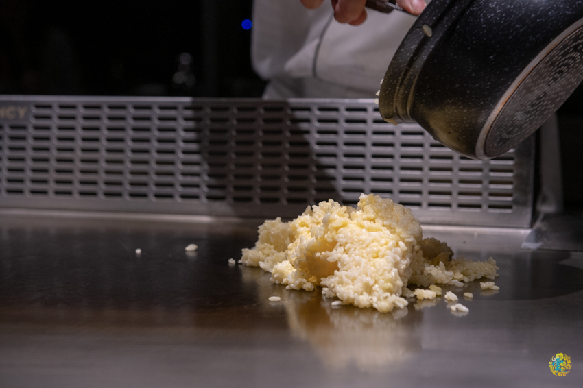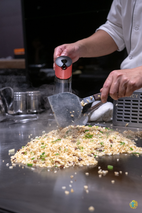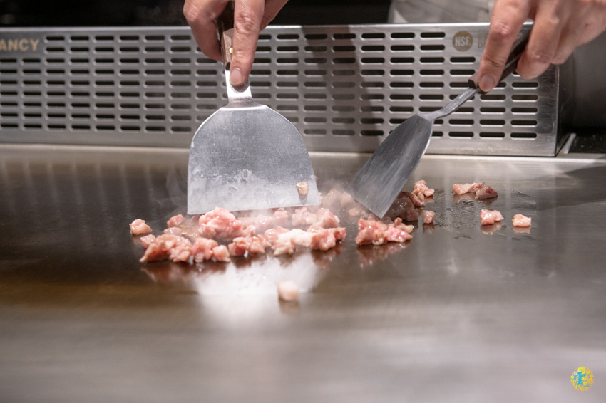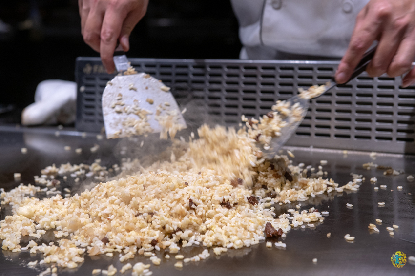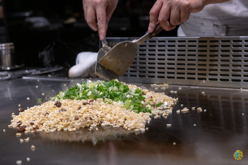 將鹿兒島黑毛和牛的筋肉下去熱炒,在加入事先已充分混合蛋液的白飯下去一起翻炒,最後鋪上蔥花加點調味,在進行最後的翻炒就完成粒粒分明香氣肆溢的和牛炒飯了。