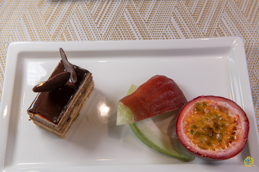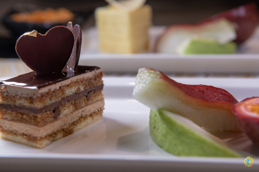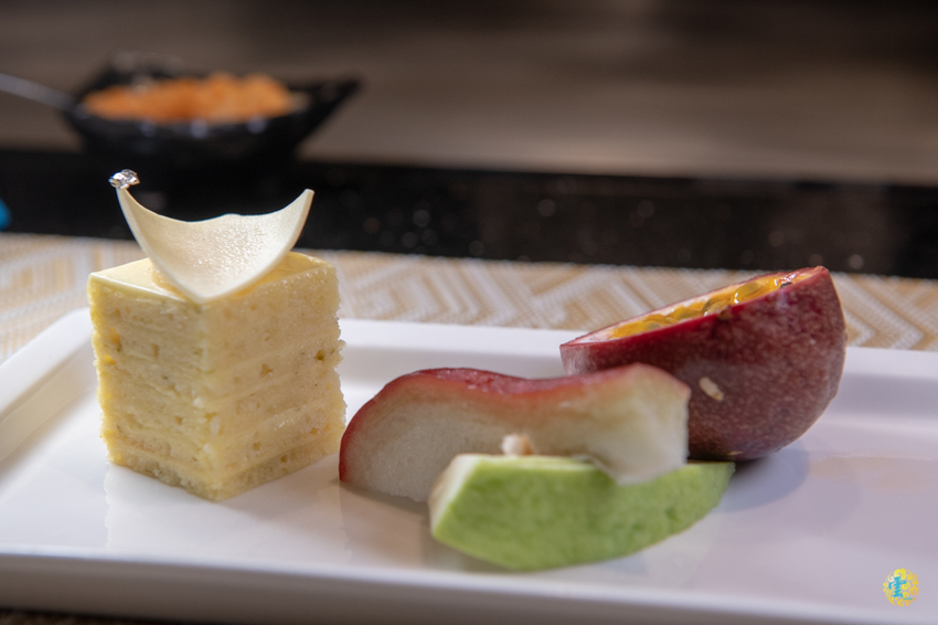 今天的飯後水果是芭樂切片、蓮霧切片與百香果,每個都鮮甜可口,台灣的水果品質真的很優。山茶花鐵板燒的甜點是跟大直名店『Pâtisserie Francis旋轉木馬點心坊』合作的,蛋糕不只美觀,口感層次更是豐富,甜而不膩的美味,層層堆疊的香甜交融出令人難忘的美味,小凌雲看了一直搶著要吃說。