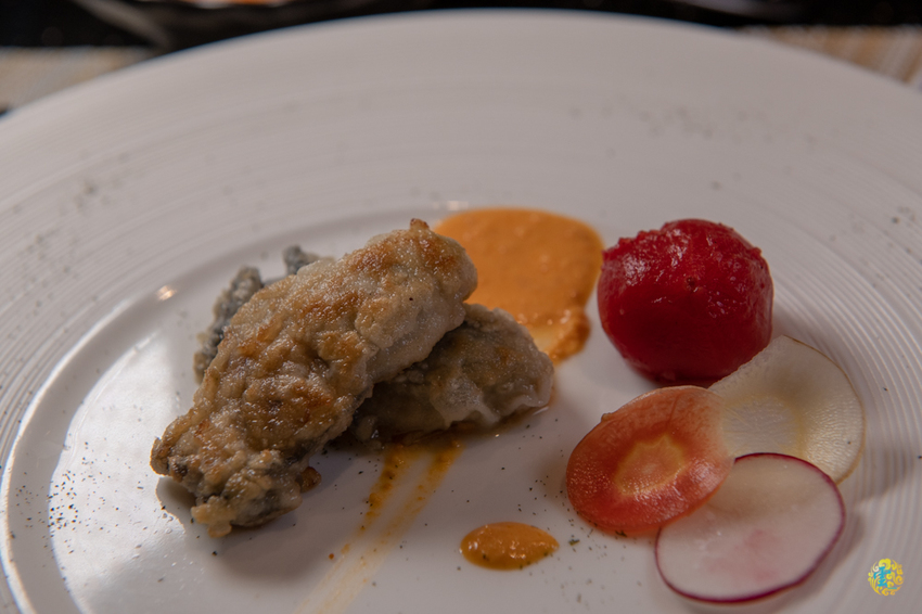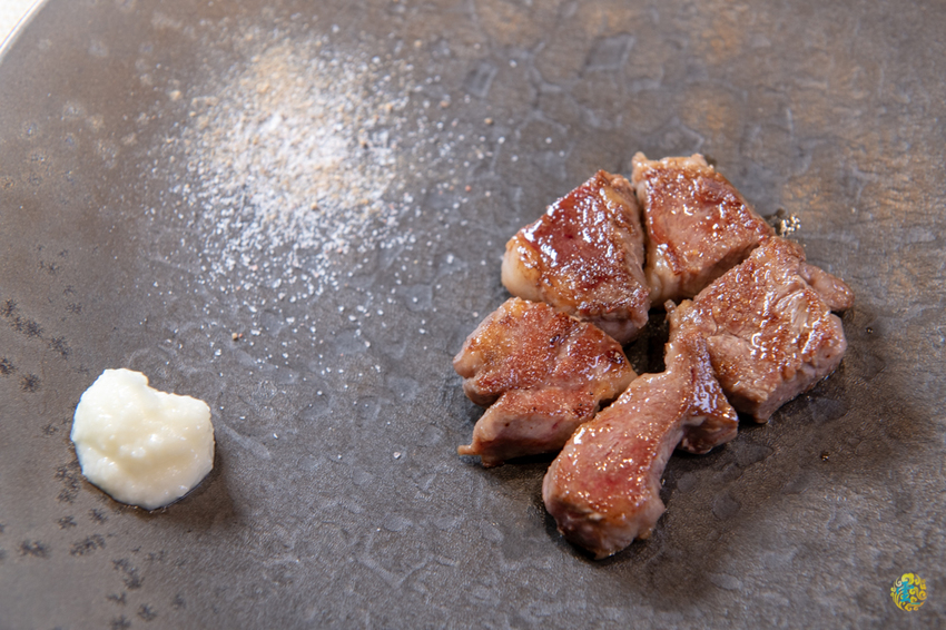 伊比利豬加熱過後,那特有的核果香氣四溢,主廚特別推薦的賞味熟度是8分熟,油脂甘甜不油膩,一入口時強烈濃郁的飽滿香氣衝擊嗅覺與味覺,淡淡的鮮甜十分引人入勝。旁邊的蒜味醬是使用蛋白、蒜末跟美奶滋調製而成,不只解膩還能將伊比利豬的清甜帶上另一個層次。