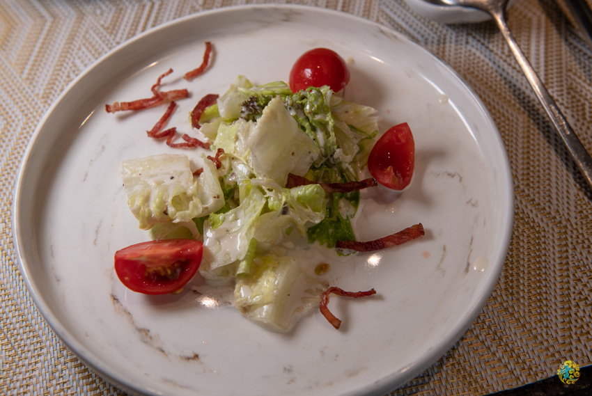 沙拉會依據季節更換內容,新鮮生菜蔬果淋上清爽的和風油醋醬,鹹香培根更添整體滋味的厚度。
