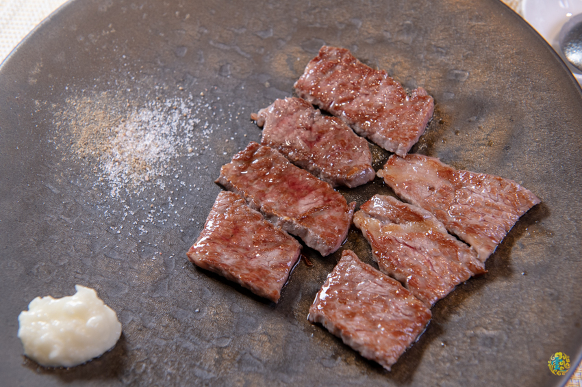 主廚推薦的賞味熟度是7分熟,店家有特別把筋膜處理掉,讓肉質更加軟嫩,牛小排的香氣毫不客氣的席捲嗅覺、挑逗味蕾,細緻綿密的油花在舌尖化開,舞動著柔嫩甘甜的口感,讓人不禁一塊再一塊。吃過原味之後,可以嘗試沾著一旁的蛋白蒜味醬,不同的風味撩動你味覺的最大值。