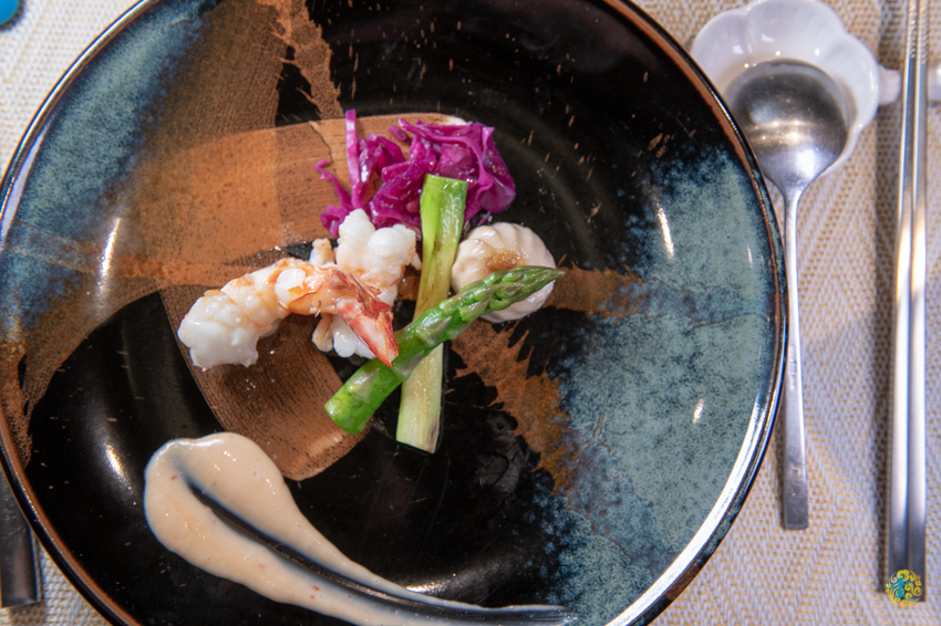 明蝦肉質緊實鮮嫩又帶有彈性,那彈舌的美味實在是筆墨難以形容,旁邊的泰式辣醬,那微微的辣度將明蝦的鮮甜輕輕托起,一首美味協奏曲在舌尖上大放異彩,特別醃漬的紅色煮高麗絲與豆苗葉,不只增添了清爽的口感,更襯出明蝦的清甜。