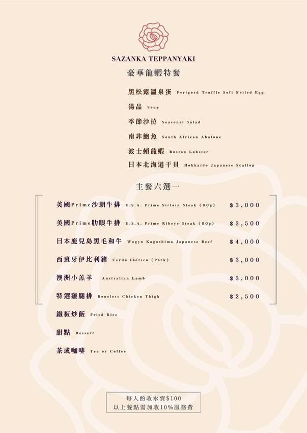 山茶花鐵板燒 Sazanka Teppanyaki的菜單一本兩面,分別是豪華龍蝦特餐與山茶花精選套餐兩種套餐式的選擇,皆收取10%的服務費與100元水資,凌雲此行享用的是兩份山茶花精選套餐。Sazanka Teppanyaki亦提供客製化的無菜單料理,只要你想得到或者你喜歡的食材,例如日本A5和牛、波士頓龍蝦、鱈場蟹、北寄貝等等,你只需要拿起手機提前致電預約,山茶花鐵板燒都能滿足你的需求,客製化料理會事先收取一定數量的訂金。山茶花鐵板燒也提供包場服務,中餐包場2萬5,晚餐包場3萬5,只要包場還提供KTV歡唱服務,且包場時的食材也提供客制化服務,食材不一定會跟著菜單走,真的是物超所值。