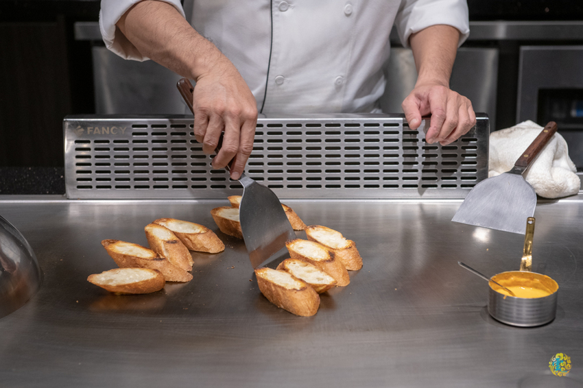 法國麵包在鐵板上加熱至金黃香酥,沾著奶油蒜味醬一起食用,濃郁蒜香盈滿口腔,酥脆略帶嚼勁的口感,讓你食慾全開。