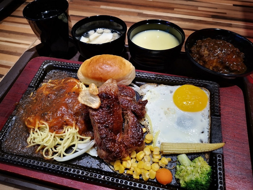 一份套餐有牛排、太陽蛋、蔬菜、餐包、玉米湯、和牛咖哩飯、粉圓豆花跟冷飲,