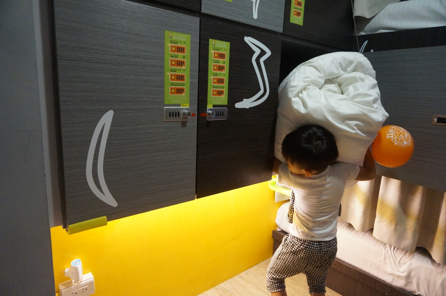 置物櫃:每個人都有屬於自己的置物櫃,依照旅館安排的床位號碼來使用,棉被也準備在個人置物櫃中,棉被取出後就可以放私人的物品,也可以上鎖,就算跟別的旅客一起住宿,也很安心。(屎蛋真的是媽咪的好幫手,啾咪!)