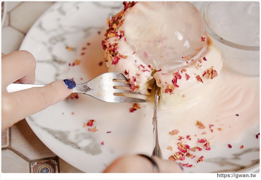 黃玫瑰單吃會比較甜,但搭配底下微鹹的奶蓋醬就剛剛好