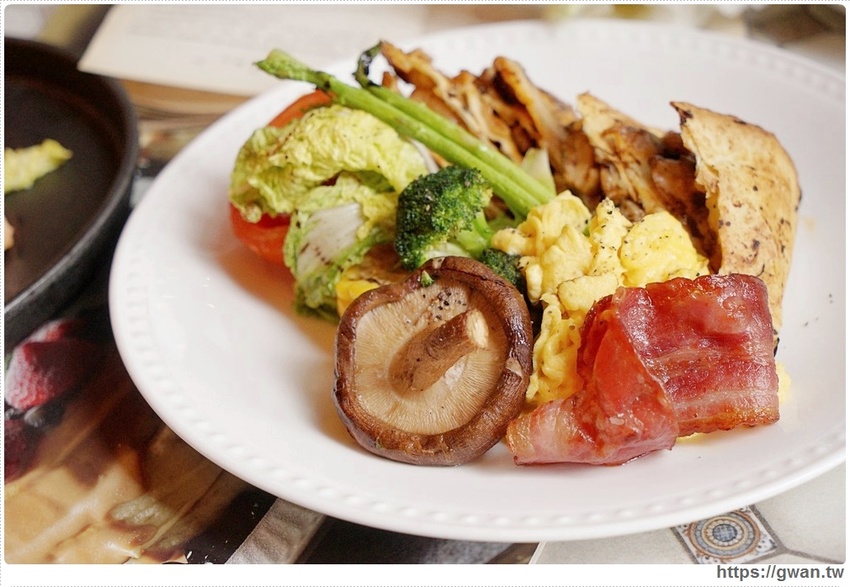 早午餐還會附早安果汁、低溫優格、烤蔬菜、炒蛋、培根