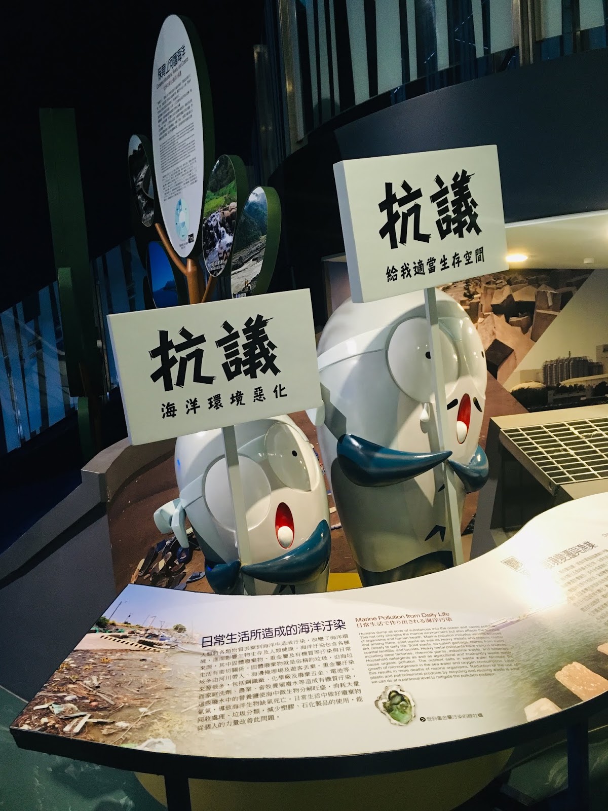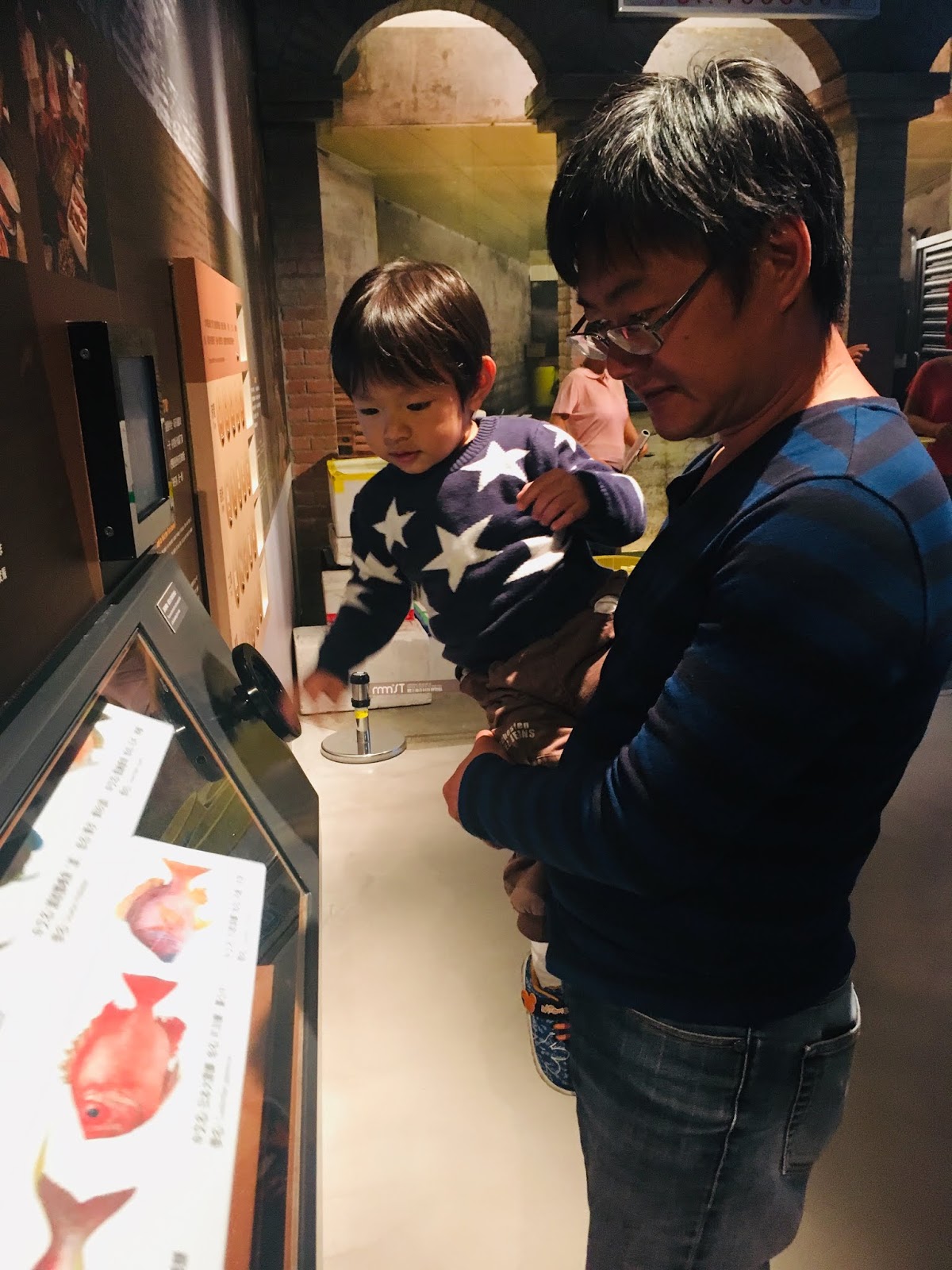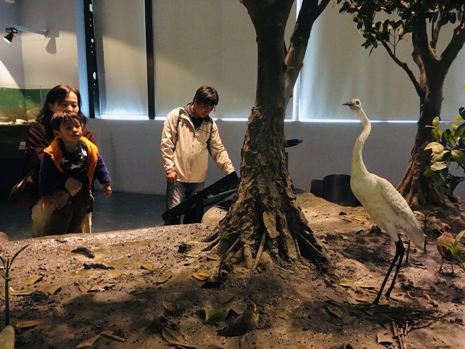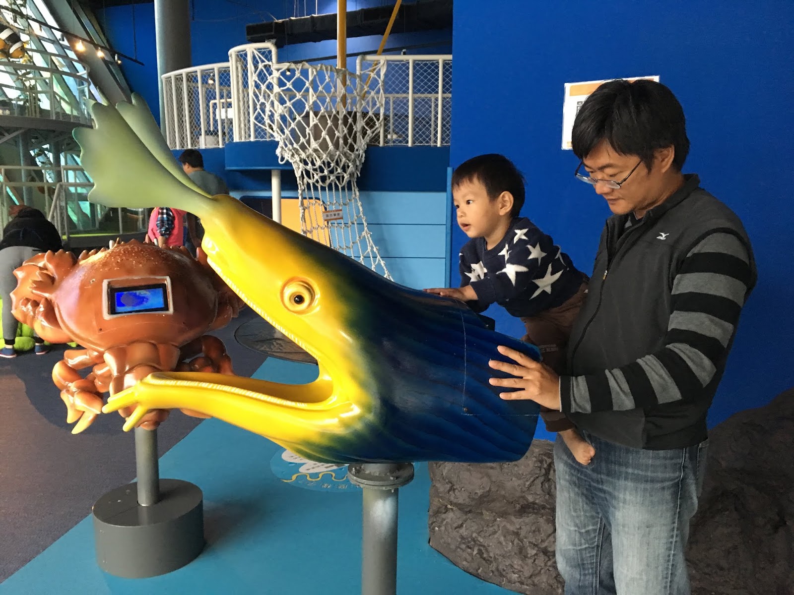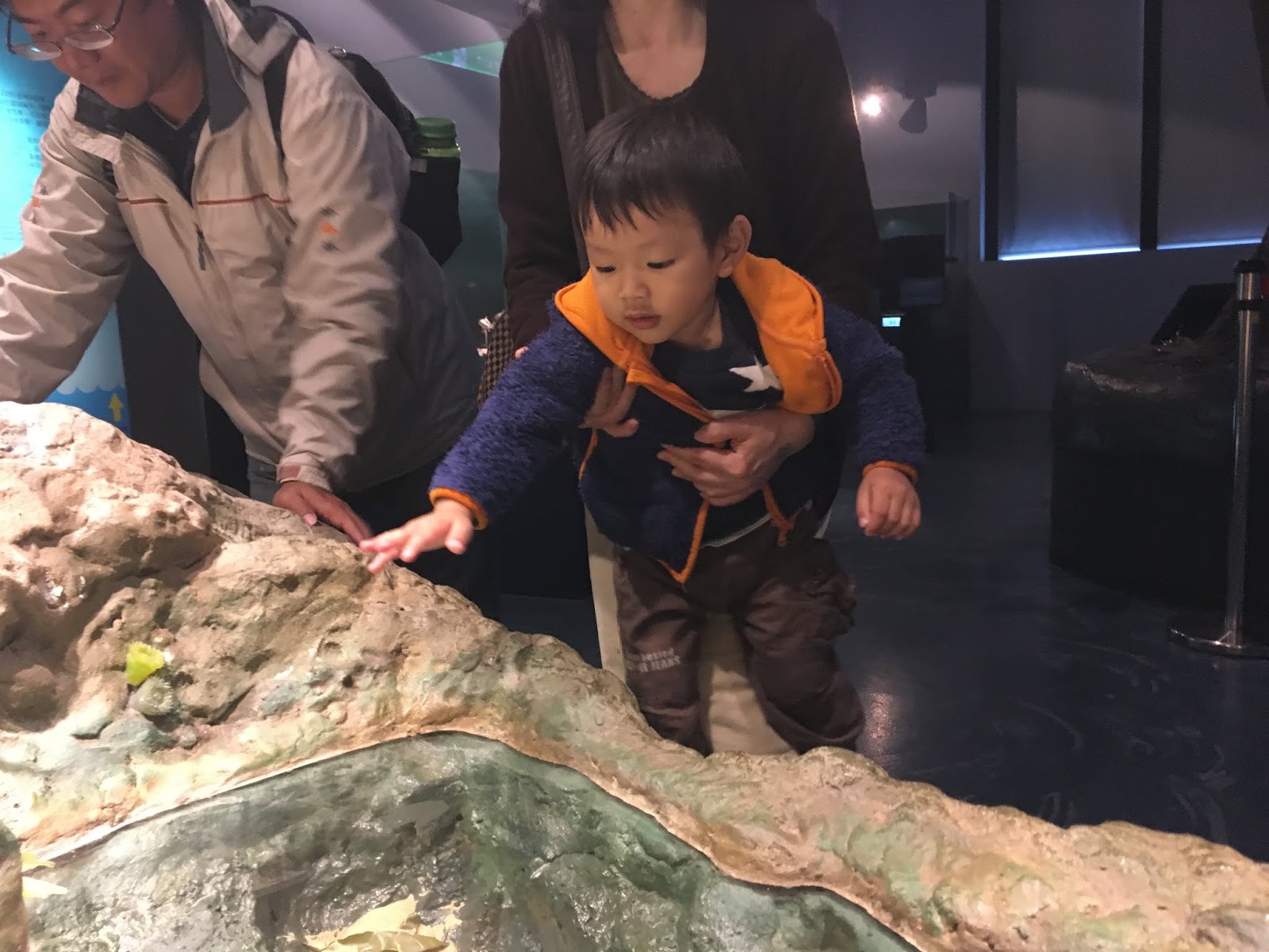 小福寶對於多元的生態環境模型感到興趣,像是潮間帶、珊瑚礁、紅樹林等,都想要認識其間的小生物,看到各種美麗的魚類更是驚異不已。孩子對自然是如此珍惜,想到他生活的未來可能充斥各種污染,就感到我們這一代有保護環境的重大責任。