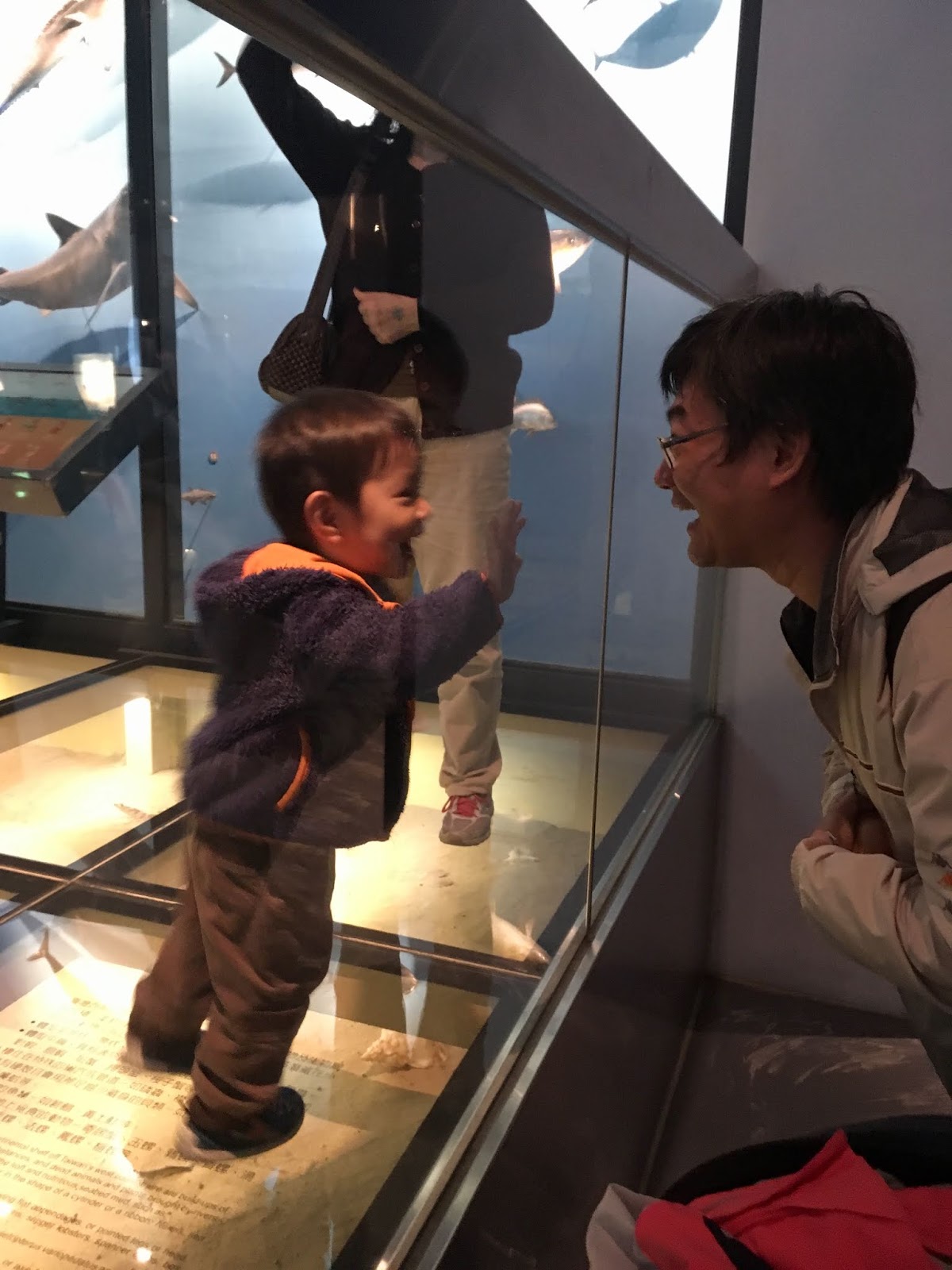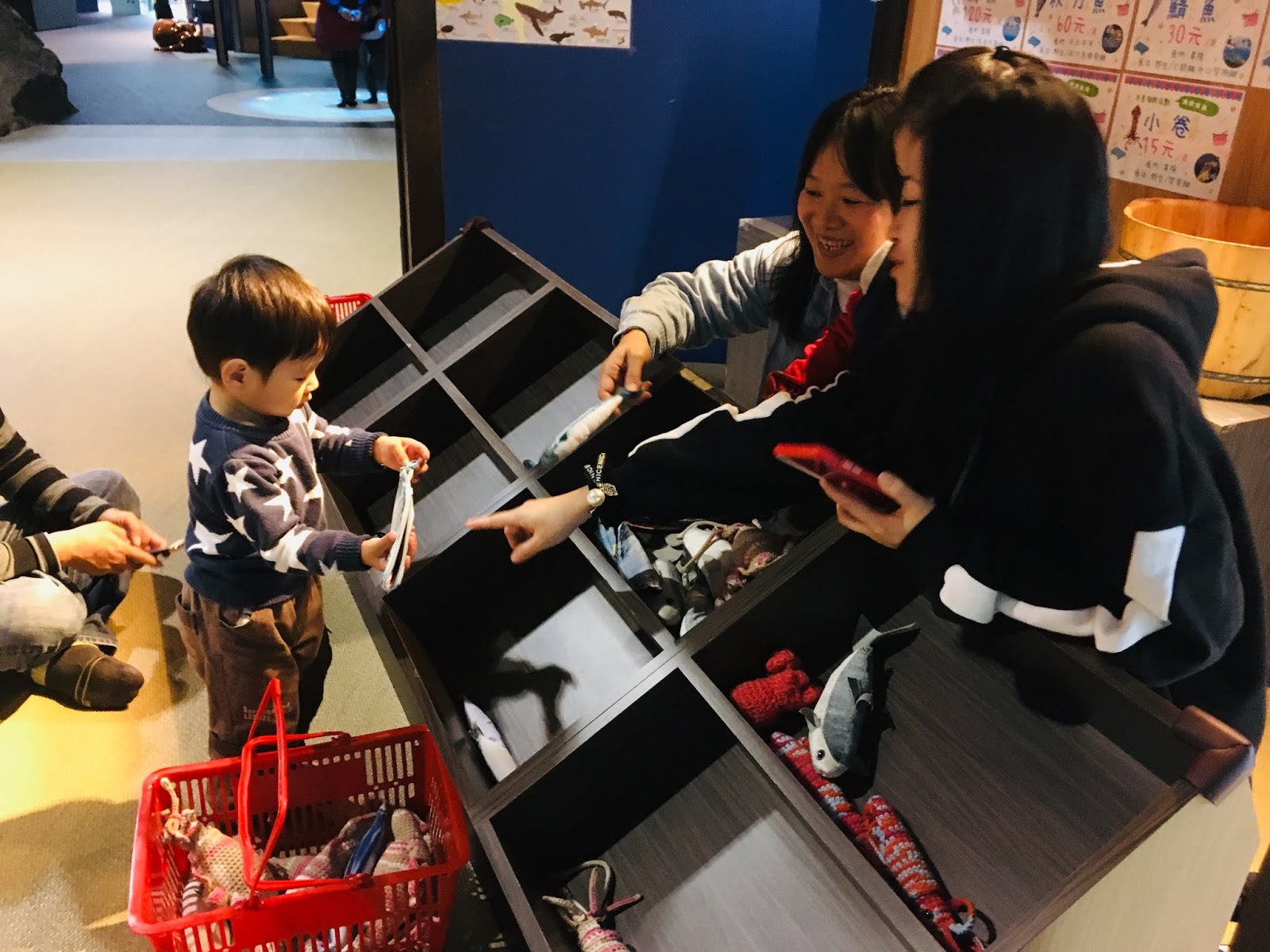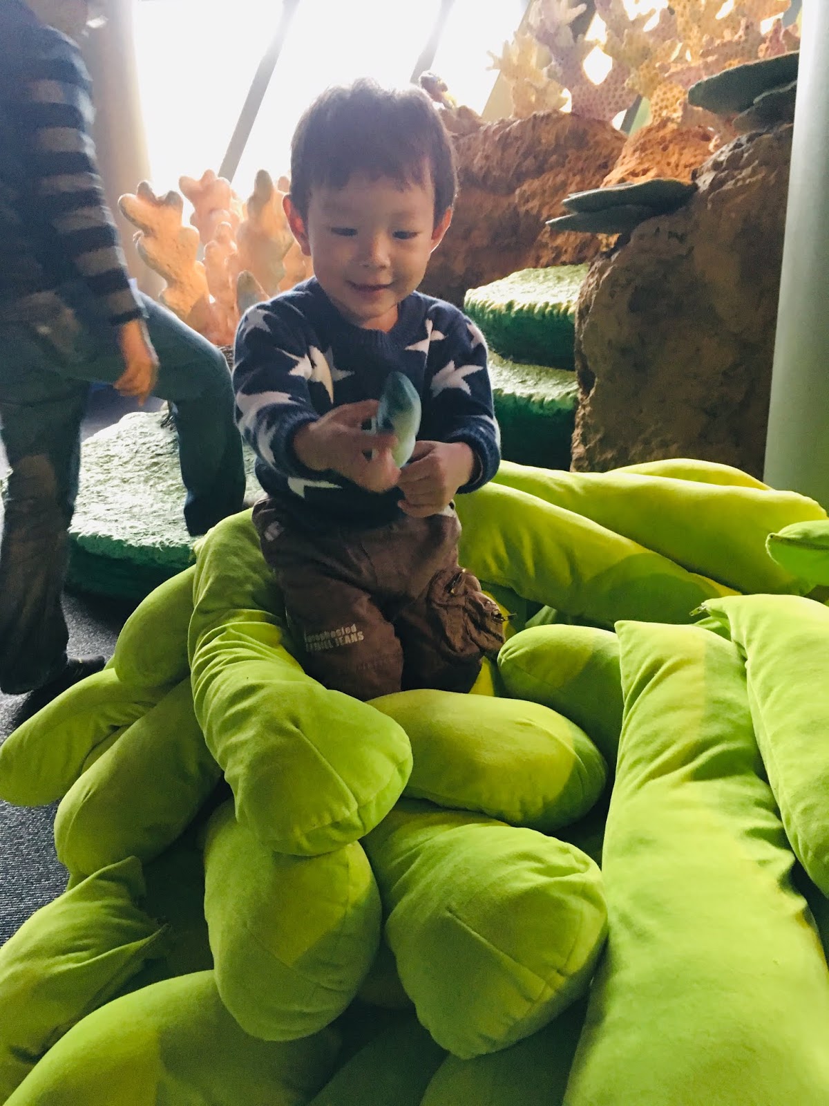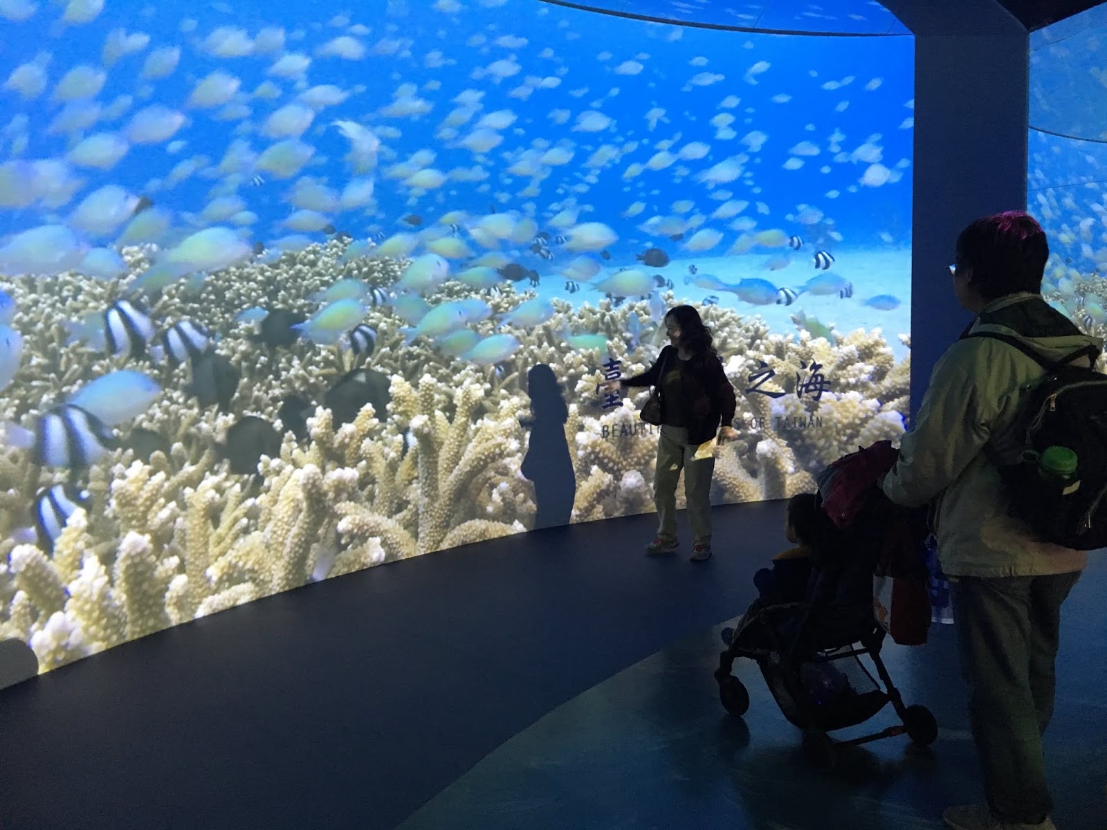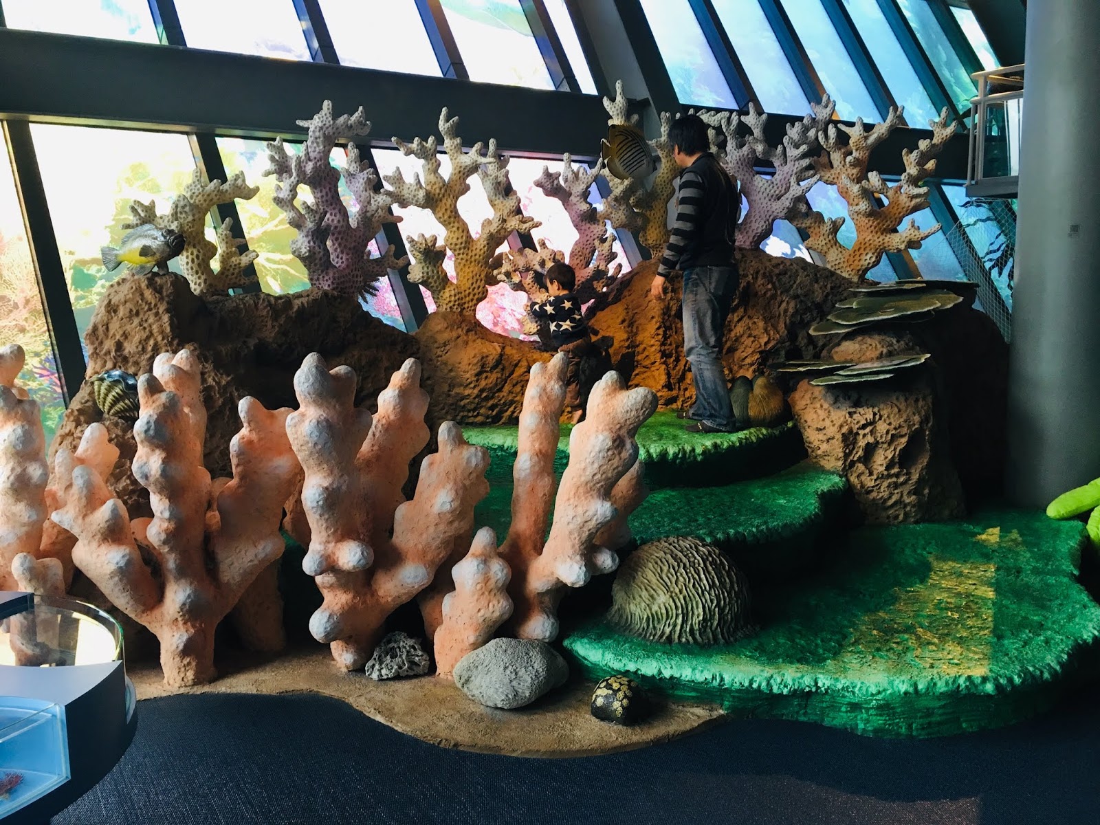 小福寶對於多元的生態環境模型感到興趣,像是潮間帶、珊瑚礁、紅樹林等,都想要認識其間的小生物,看到各種美麗的魚類更是驚異不已。孩子對自然是如此珍惜,想到他生活的未來可能充斥各種污染,就感到我們這一代有保護環境的重大責任。