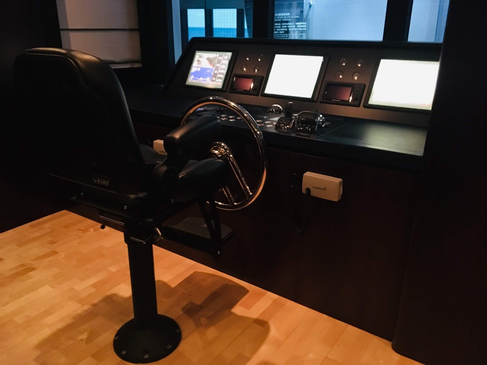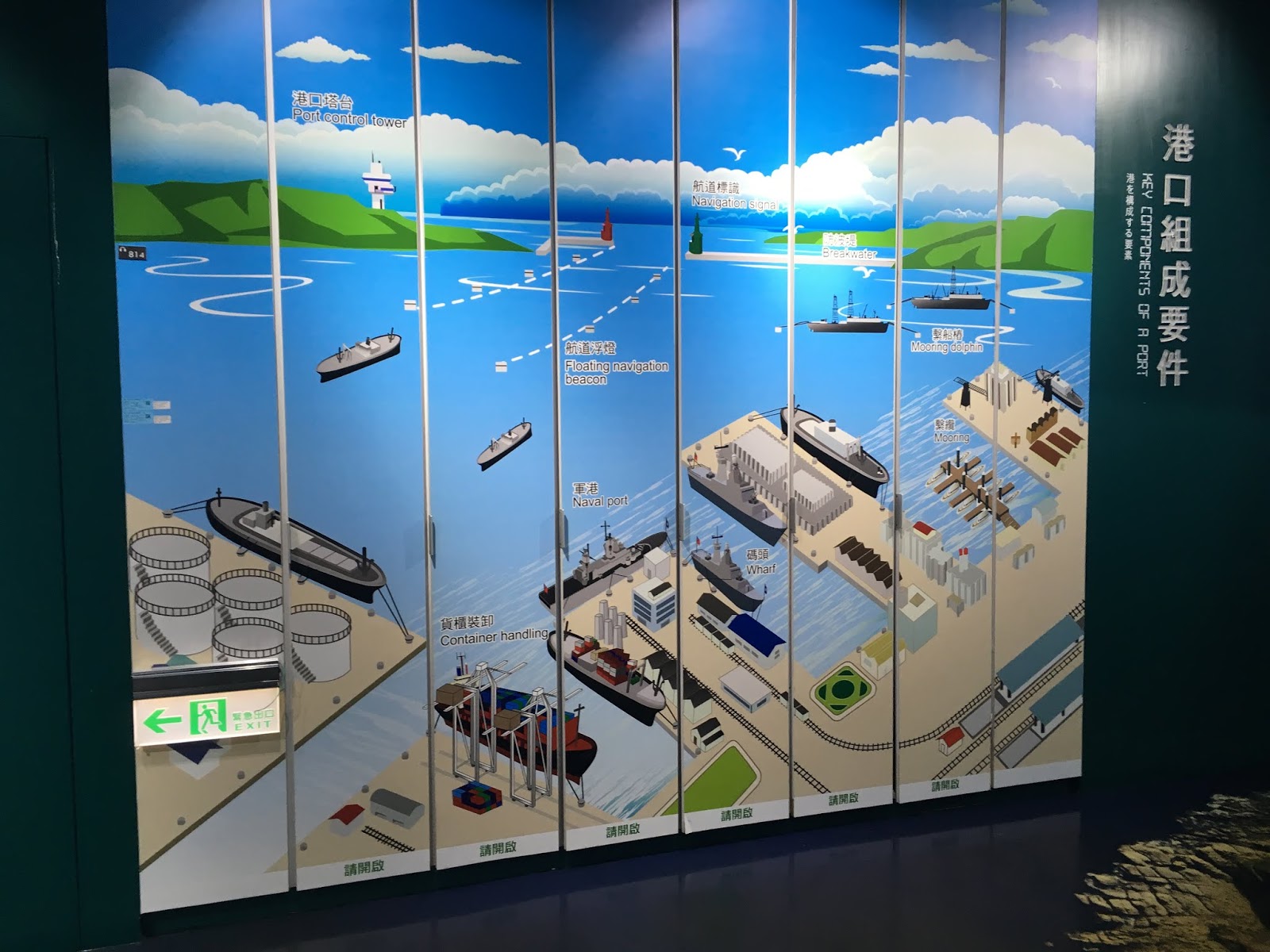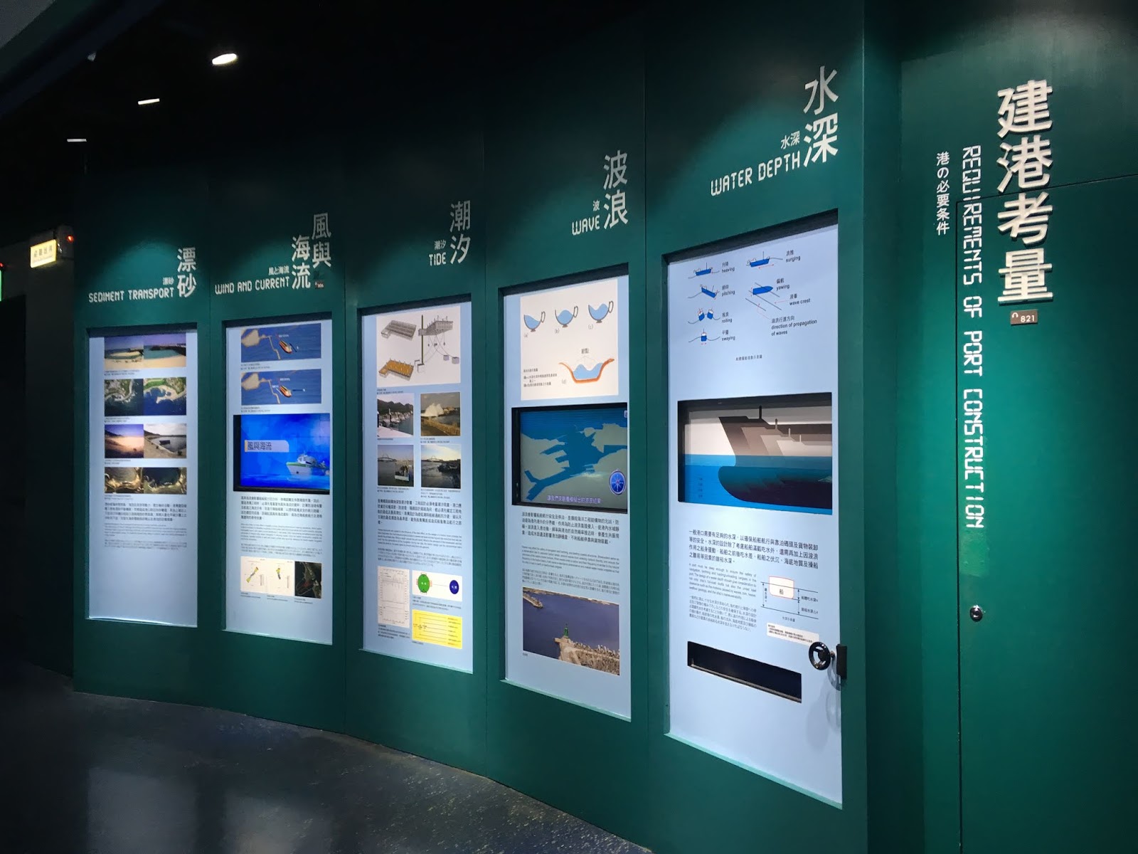 中央有一艘貨櫃船模型,雖已經是縮小的1/10 比例,但在展廳中還是很巨大。船身切成5部分,分別展示出機艙、不同船舶種類之橫剖面型態、結構佈置以及甲板艤裝佈置情形,孩子們在貨櫃船中跑上跑下穿梭,對船舶機構的運作也烙印在腦海裡,真的是很用心的教學設計。
