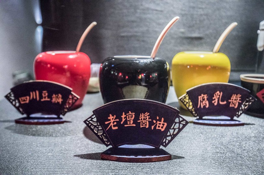 四川龍府的醬料區,裝醬料的的瓷瓶也好漂亮,所提供的醬料也與一般火鍋店不太一樣,有腐乳醬、老壇醬油、四川豆瓣,可以隨自己喜好來調配,不過咬咬都沒用到就是了