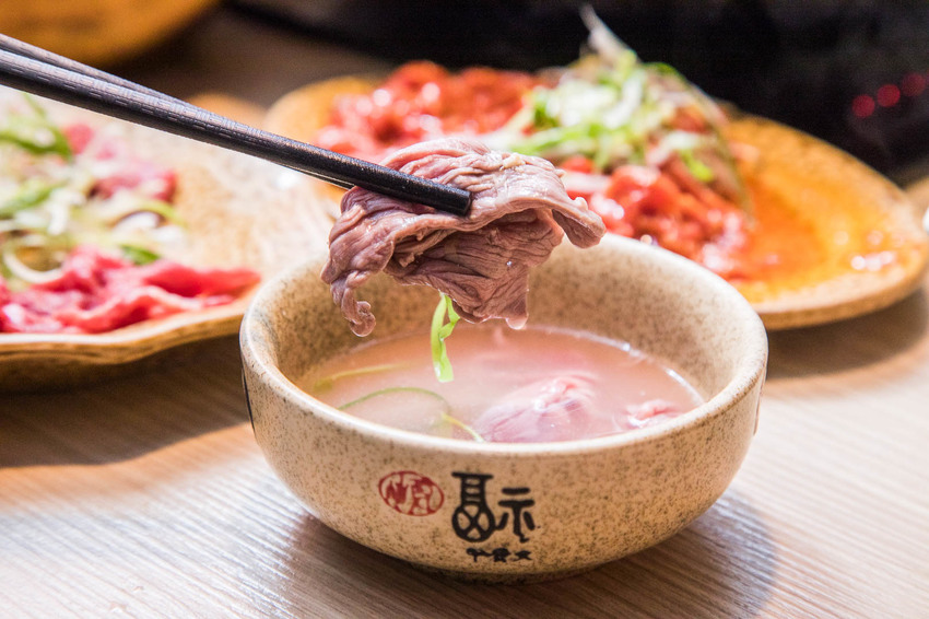 還有一種吃法就是類似台南牛肉湯的吃法,先將溫體牛放入碗中,加點蔥絲,再將滾熱皮蛋香菜湯沖入碗中,藉由湯的熱度將溫體牛泡熟,吃起來口感更是滑嫩,牛肉的肉汁精華也滲入湯中,極鮮好喝!