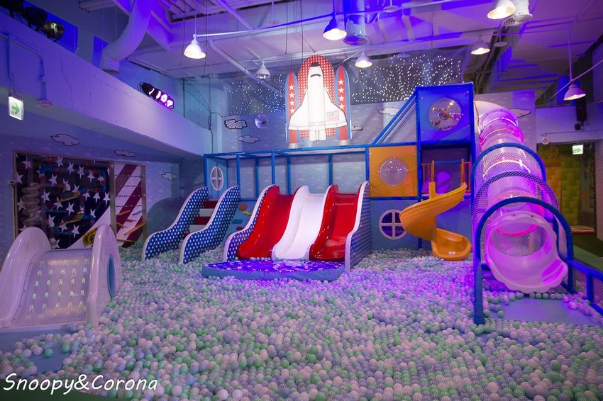 以太空為主題的溜滑梯是超大球池、S型溜滑梯、