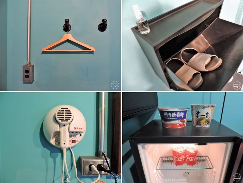 房間內的其他設施,包含提供室內拖鞋,拖鞋上方還有消毒酒精可以使用;房內也有衣架,而懸掛衣架的造型也是工業風水管;吹風機是壁掛式的,不過是強而有力的達新牌吹風機,風力強到可以把我的長頭髮吹乾吹風機都不會自動斷電;而房間內也有小冰箱,除了冰箱內有兩瓶可樂外,上方也有杯麵,這些都是免費提供給房客的,這樣宵夜就有著落了。
