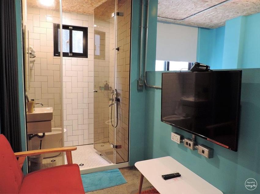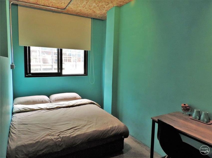 房間的顏色蠻鮮豔的,整個房間都是用天空藍做牆的顏色,而黑金文旅的每一個房型配色都不一樣,其他也有草綠色、橘色等顏色,覺得工業風的房型不會那麼冰冷。