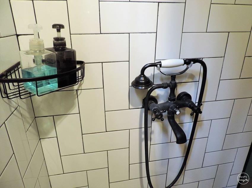 浴室就在房間最深處,外面雖然是全玻璃不過有簾子可以把整個浴室都遮起來,洗澡不會洗的那麼害臊;每間房間都有提供大浴巾(這點我很喜歡)跟拋棄式牙膏組,浴室內也有提供洗髮精跟沐浴精,而且蓮蓬頭相當有創意,居然是復古電話造型,而且還意外的好握。XD