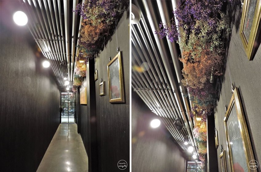 一樓進來的通道上方則使用乾燥花布置,明明乾燥花跟工業風就不算是能搭在一起的物件,可是在這邊看到這樣的搭配突然覺得好美哈哈哈哈很神奇。