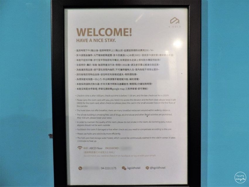 房內的注意事項,包含退房時間、wifi提供等(旅店均有提供免費wifi),連續入住兩晚以上的話並不會提供清掃服務,不過像是垃圾滿了或是想要換浴巾的話都可以告知櫃台,他們就會派人處理。