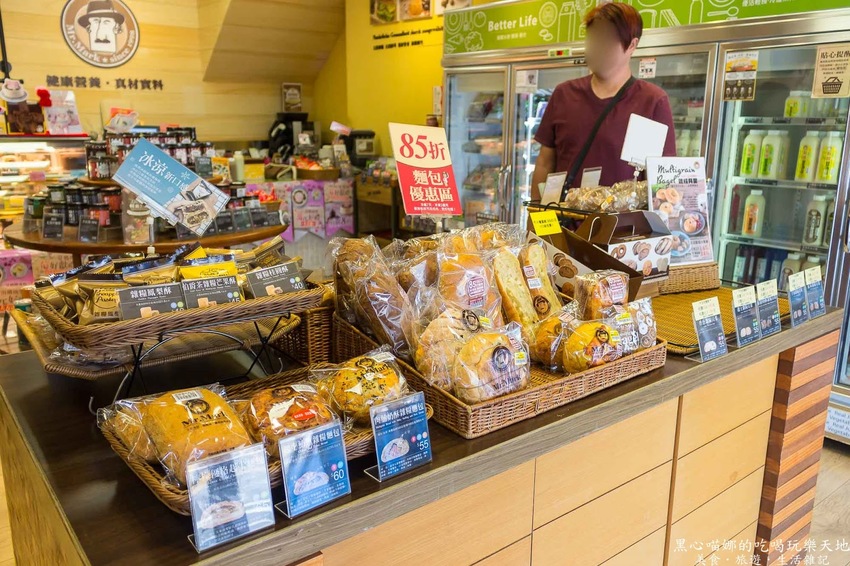 旁邊展示擺放著無調味堅果、麵條、高纖雜糧小零嘴、有機白米、芝麻粉、杏仁粉、麥片、多款養生沖泡飲品…等商品。