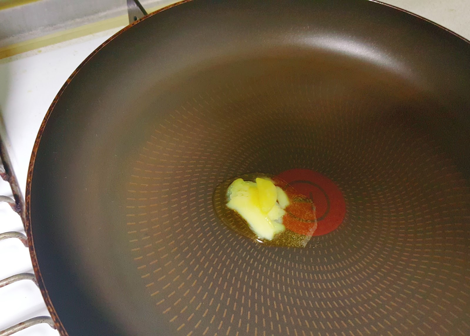 1. 中火熱鍋,把一匙雞油放入鍋中加熱融化