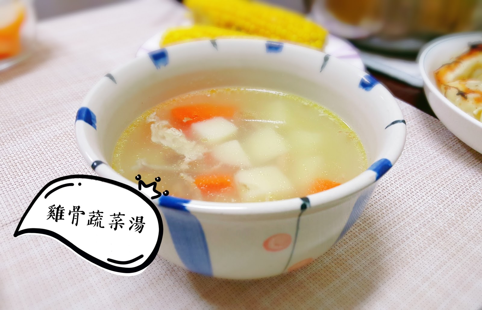 用雞骨熬湯比直接用雞肉煮蔬菜雞湯,味道要清淡許多,也少了許多油脂,湯面只有一點點油。玉米紅蘿蔔和馬鈴薯的甜味讓湯味道甘甜,夏天喝起來很清爽。下次來試試看用竹筍或是鳳梨加苦瓜。