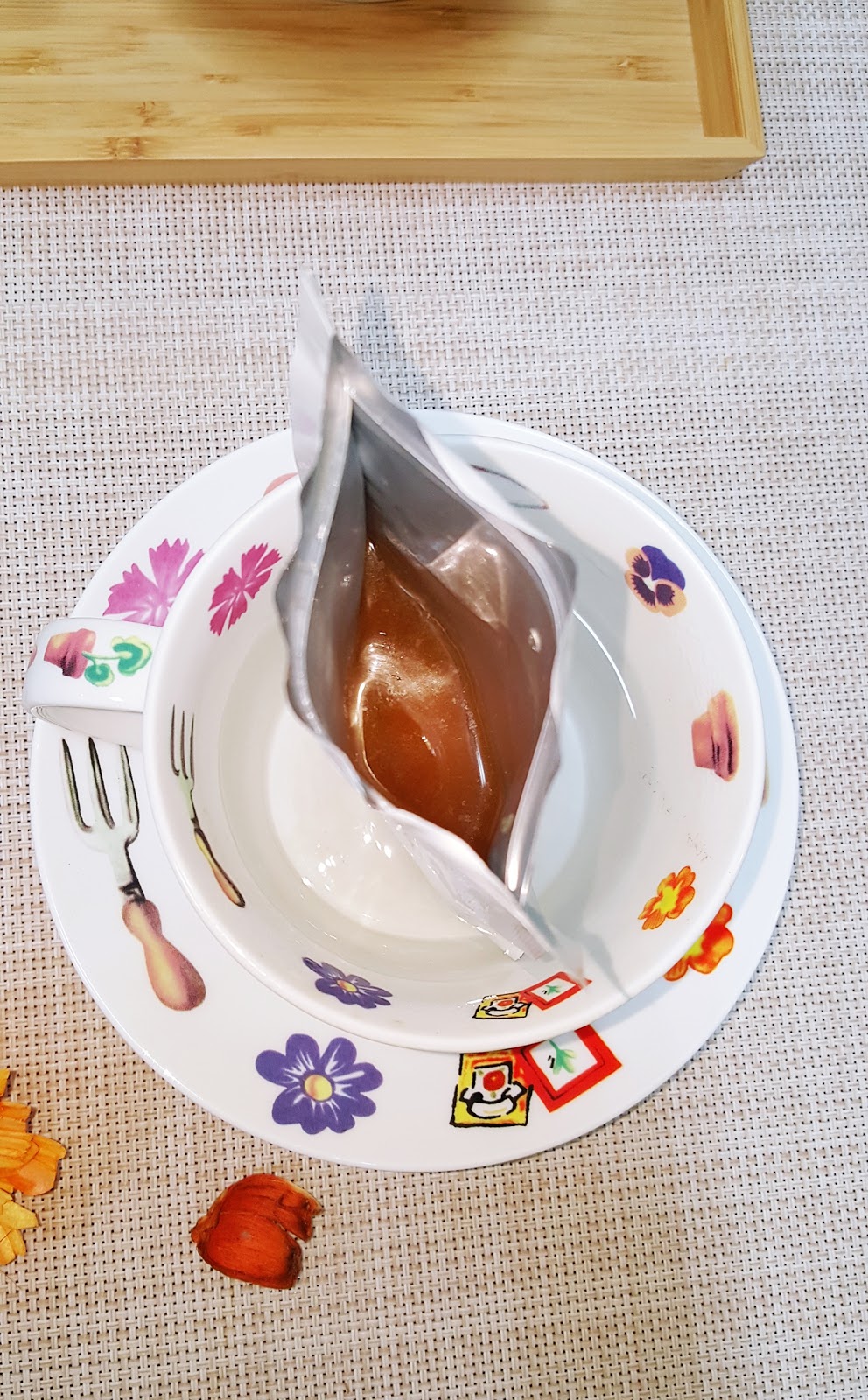 單包包裝設計成立體袋,也就是它可以乖乖自己「站好」,撐開底部後放在桌上不會傾倒喔!我採用方法(B)隔水加熱,不用開火也不用微波。