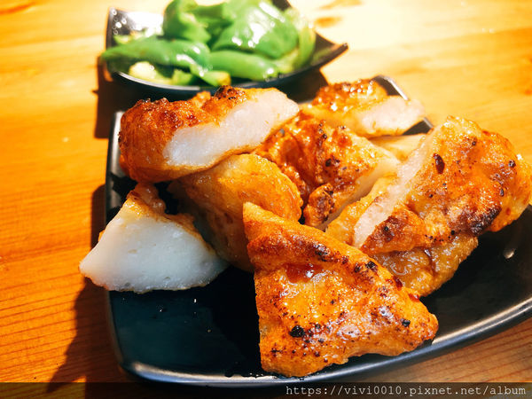 一開始先上的是下酒小物-烤豆皮、烤青椒、甜不辣(各NT$60元)
