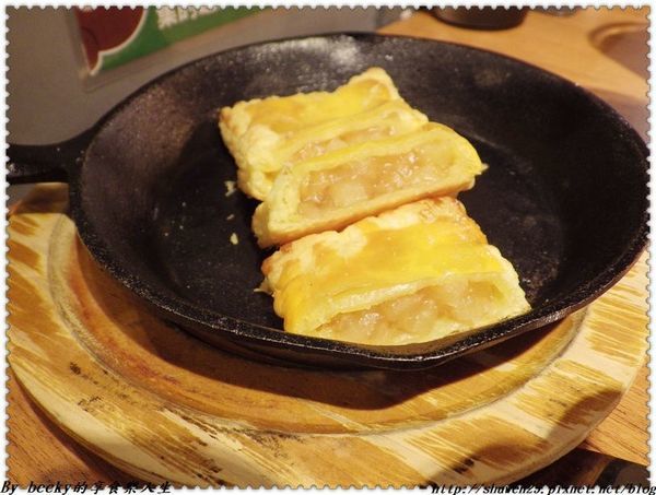 這個是最後的甜點,看似簡單卻是美味,外層是酥皮,內層是蘋果內餡,裡頭還有蘋果塊,外皮是酥酥柔軟,內餡則是帶有酸甜感,在嘴中咀嚼有蘋果小塊,微酸微甜很適合當最後飯後甜點。
