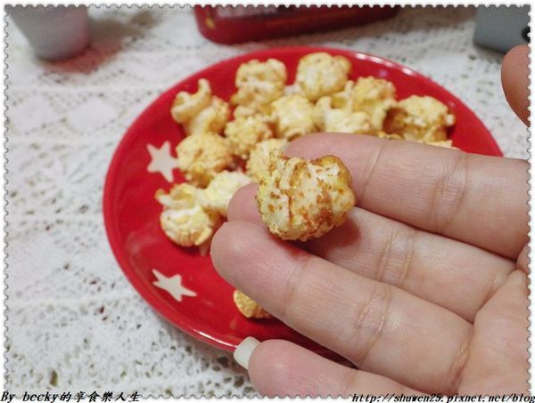 倒入盤中,可以看到一顆一顆含有肉紙且經過篩選大小一致的爆米花。