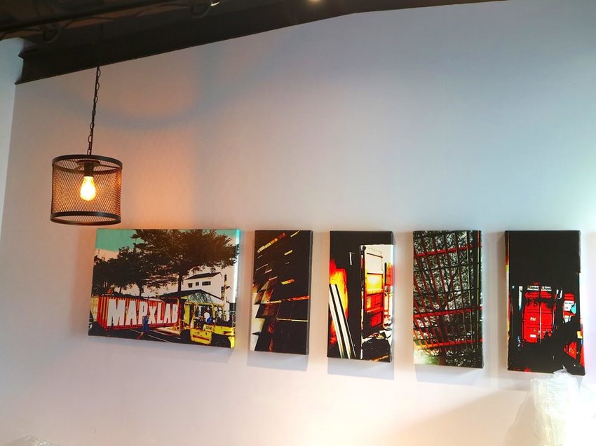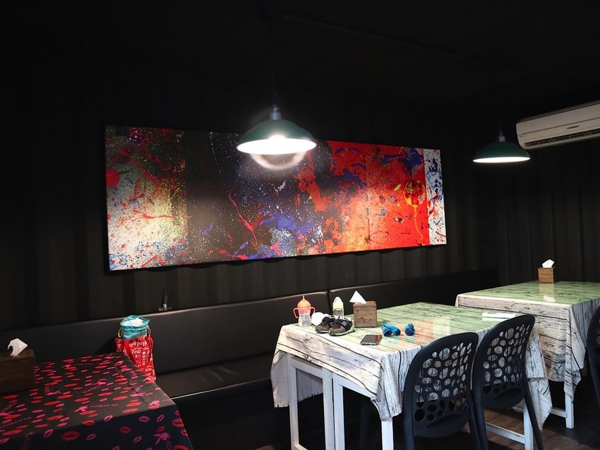 黑色系裝潢,牆上則是大面個性噴墨畫 和 進貨櫃時的店家影像紀錄