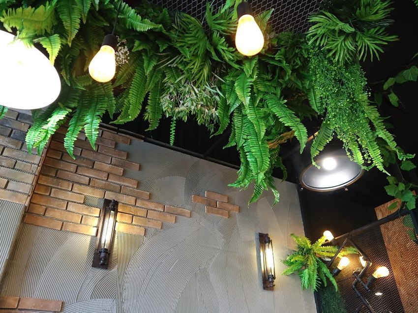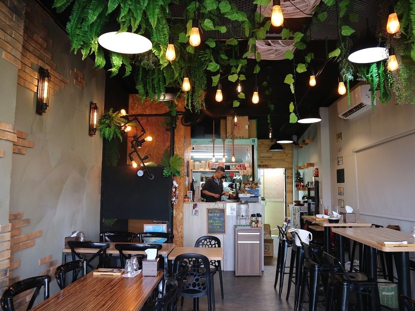 木質桌椅、水泥磚牆、工業風燈具、高腳桌椅,營造出輕鬆的用餐氛圍